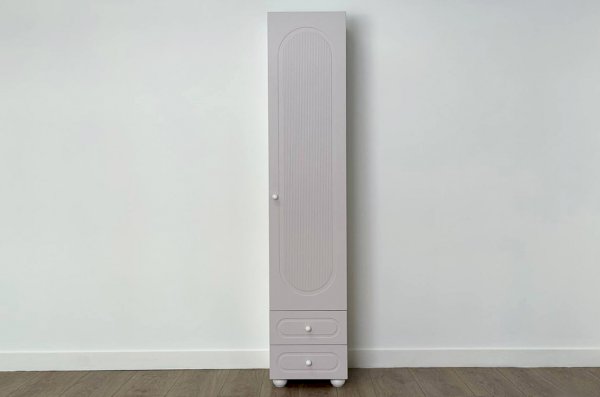 Модуль оснащён одной распашной дверцей и двумя вместительными выкатными ящиками в нижней части, предназначенными для хранения одежды, текстиля или аксессуаров. Внутреннее наполнение можно выбрать в зависимости от потребностей: шкаф может быть укомплектован полками или штангой для плечиков, что делает его удобным для хранения как сложенных вещей, так и одежды на вешалках.