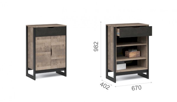 Комод включает выдвижной ящик и шкаф с распашными дверями и полкой внутри