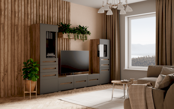 Стильная и очень вместительная тумба под ТВ Наоми является частью одноимённой модульной серии. Модель выполнена из качественной ЛДСП, а фасады отделаны МДФ. На столешнице тумбы поместится телевизор любого размера, а  в секциях с распашными створками можно хранить необходимую технику или аксессуары для нее.