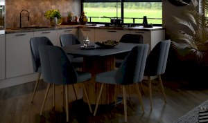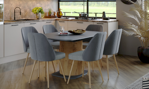 У данной модели стола оригинальный декор подстолья выполненный из реек, четкие линии и округлые силуэты, которые работают на контрасте, усиливая друг друга.