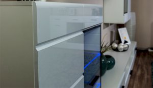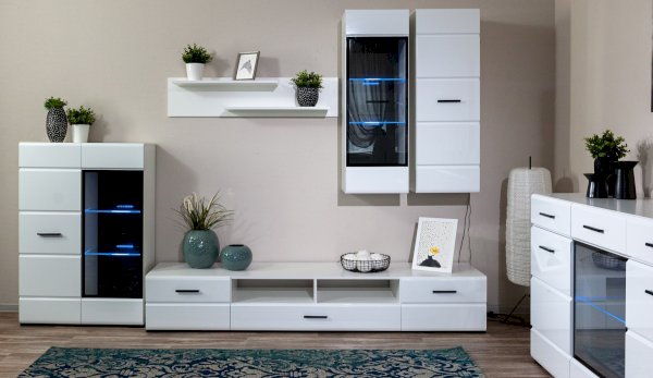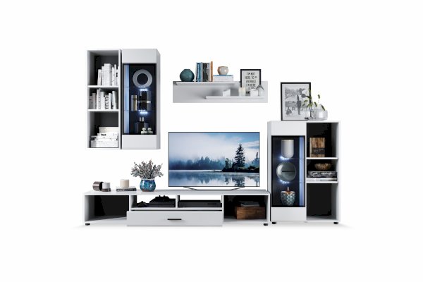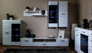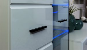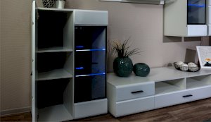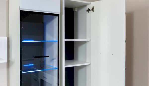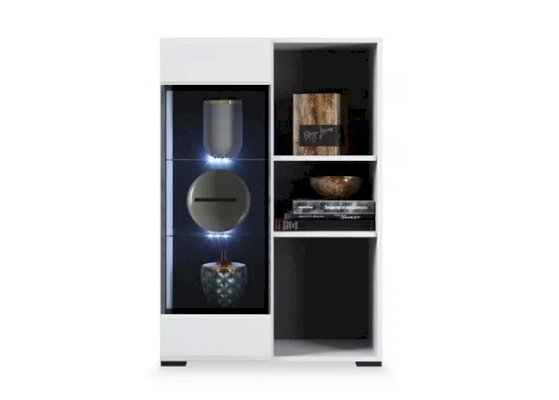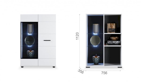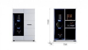 Белые глянцевые фасады МДФ и витрина с прозрачным стеклом сделают Вашу гостиную светлее и уютнее. Задняя стенка комода Йорк черного цвета красиво контрастирует с фасадами и корпусом белого цвета. Светодиодная подсветка сделает акцент на дорогих для Вас вещах, таких как фото, статуэтки, посуда или книги. На комод можно поставить вазу с цветами или украсить Вашу гостиную другими милыми вещами, а вместительные полки порадуют Вас своими размерами. Комод выполнен из экологически безопасных материалов.