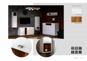 Гостиная модульная система сочетает в себе актуальные цвета и функциональную геометрическую форму с мотивами конструктивизма.