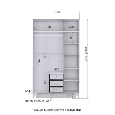 Внутреннее наполнение: Выдвижные ящики, 3 комплекта на шариковых направляющих, петли с доводчиком, штанга для одежды.