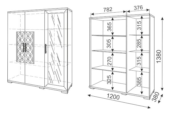 • За рамочным фасадом 3 съемные стеклянные полки, за глухим - 3 съемные полки ЛДСП.