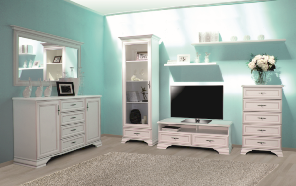Кентаки - мебель классического стиля, отличающаяся природными цветами, отделкой фактурой, всегда актуально и востребована, она настолько универсальна, что без проблем впишется в любой современный дизайн. Стиль набора модульной мебели подчеркивается лакированной патинированной планкой в фасадах, карнизами - завершающим акцентом в зеркалах и высоких элементах набора, витиеватыми ручками. Пять узких, но вместительных выдвижных ящика.