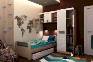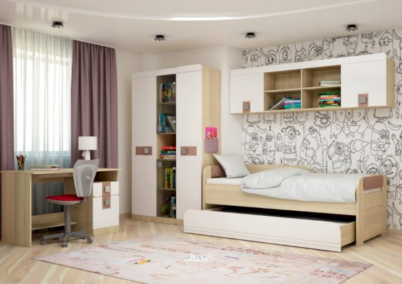 Мебель для детей «Стиль» в цвете «Кофе с молоком» отличается мягкостью, теплотой, особым уютом, что очень актуально для интерьера. Важное свойство глянцевой поверхности - оно визуально расширяет пространство. Модульный ряд состоит из шкафов, кроватей для одного или двух детей, письменного стола со встроенной тумбой, вместительных стеллажей и навесных полок для хранения книг, журналов, детских поделок, фотографий, сувениров. Яркая, стильная, но при этом удобная и вместительная, такая мебель будет радовать Ваших детей долгие годы.
