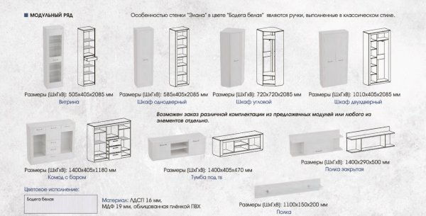 Модульная гостиная Элана Бодега белая (МБГ) - за 27 139 руб. в Ступино. Купите на сайте stupino.onlinemarketmebeli.ru или по телефону 8(800)505-30-63 уже сегодня! Уточнить наличие, комплектацию, актуальную цену можно бесплатно у менеджера ежедневно. Закажите Модульная гостиная Элана Бодега белая (МБГ) до конца акции! Доступна покупка в кредит, рассрочку. Доставим со склада или на заказ.