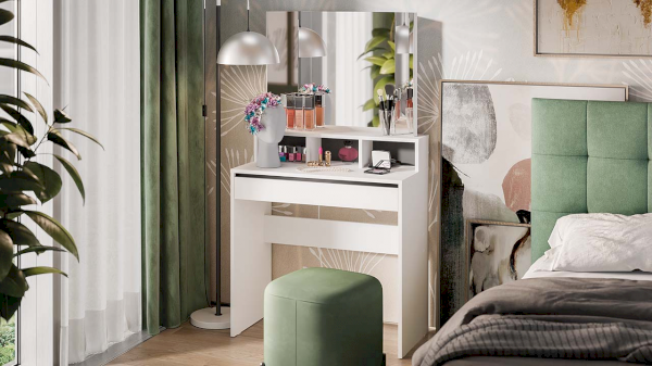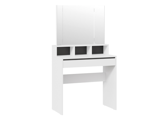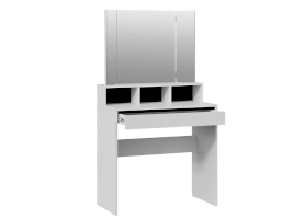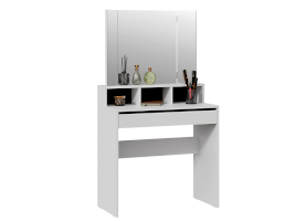 Туалетный стол «Софт» в белом цвете идеально подойдет как для светлого помещения, так и для интерьеров в темных тонах. Черные вставки на задней стенке под зеркалом и над выдвижным ящиком создают современный и стильный дизайн, который подходит для любых интерьеров. Черные элементы дизайна являются лаконичными акцентами, которые придают туалетному столу утонченность и изысканность.