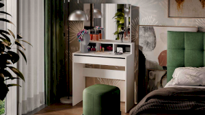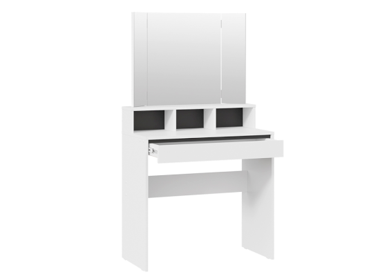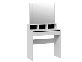 Помимо внешней привлекательности стол оснащен большим зеркалом с поворотными зеркальными створками, вместительную столешницу с надстройкой и выдвижной ящик. Благодаря удобным отсекам, вы сможете организованно хранить все необходимые аксессуары и косметику, обеспечивая легкий доступ к ним в любой момент. Это поможет поддерживать порядок и удобство в Вашем уголке красоты.