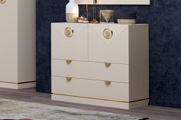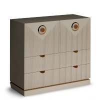 Конструкция комода включает два широких ящика, а также два закрытых отделения с дверками. Украсить интерьер можно разместив на столешнице комода декоративные предметы, вазы или любимые фотографии.