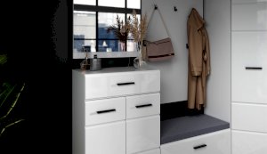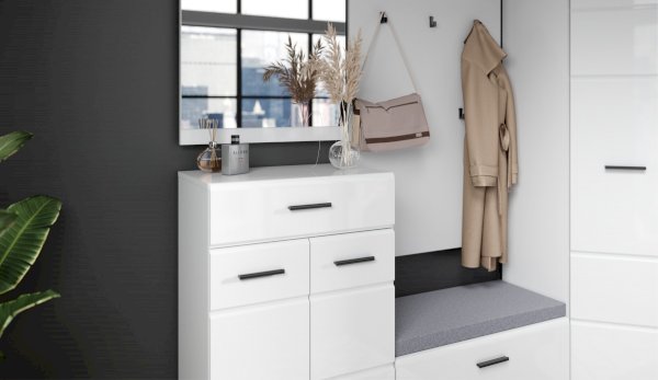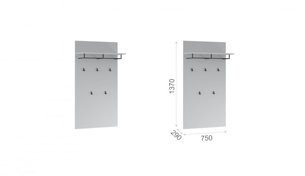 Компактная и функциональная вешалка из белого ЛДСП включает в себя самое необходимое для организации хранения в прихожей. Верхняя полка разместит головные уборы, а металлическая штанга и пять крепких крючков контрастного черного цвета поместят на себе одежду объемом с небольшой шкаф. Идеально компонуется со всеми модулями системы Йорк.