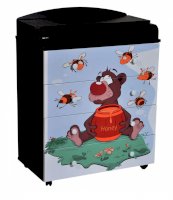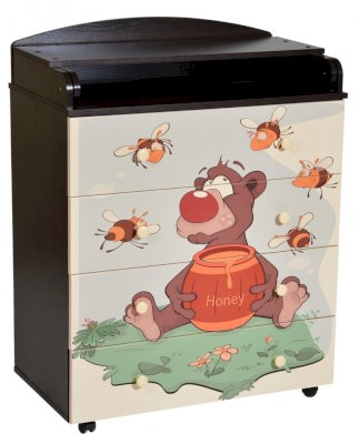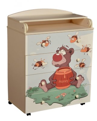 Пеленальный комод 800/4 Lilu 4 отличается привлекательным дизайном с использованием тематических детских принтов. В конструкции изделия предусмотрены 4 маленьких передвижных колеса, несколько вместительных ящичков на шариковых направляющих и откидывающаяся пеленальная столешница. Детский пеленальный комод, декорированный красочным рисунком, вмещает в себя постельные принадлежности, средства гигиены, распашонки, подгузники, игрушки, ползунки и другие личные вещи ребенка. Гладкая столешница идеально подходит для пеленания ребенка, а колесики позволяют быстро перемещать комод.