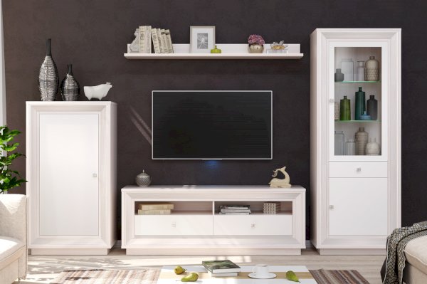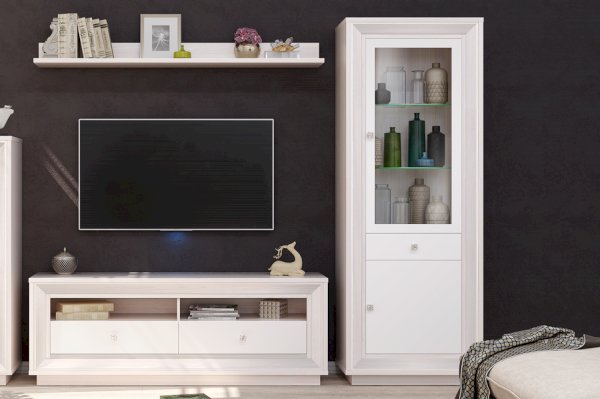 В центральной части расположен выдвижной ящик, в котором вы сможете хранить различные мелочи или аксессуары. Отделение с глухой дверкой разделено полкой для вашего удобства. Витрина оформлена стеклодверью в рамочном профиле МДФ и стеклополкой с прозрачным стеклом толщиной 6 мм.