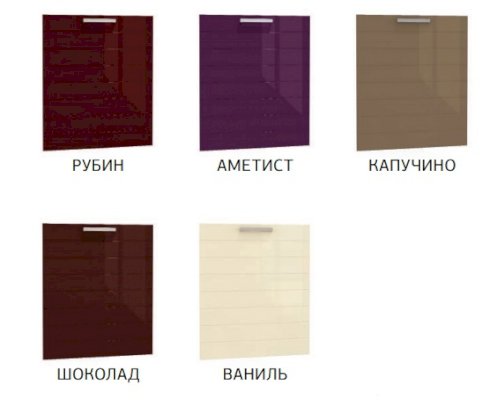 Каркасы: ЛДСП Глубина каркасов нижних шкафов - 530 мм, Глубина каркасов верхних шкафов - 320 мм. Цоколь ЛДСП - в комплекте с нижним шкафом, выдвижные ящики - метабоксы. Фасады: МДФ фрезерованная, окутанная глянцевой пленкой ПВХ. Цвета фасадов - ванильный, аметист (фиолетовый), рубин (бордовый), шоколад, капучино Витрины - матовое стекло.