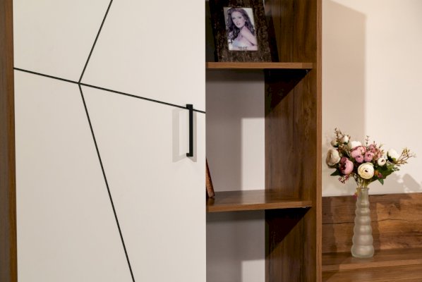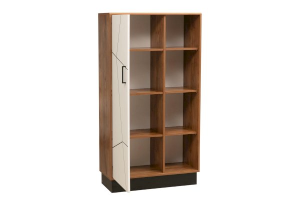 Абсолютно уникальный шкаф! В отличие от своих мебельных коллег, он имеет сравнительно небольшую высоту – всего 1575 мм. В мебельной группе со стандартно высоким шкафом-пеналом выглядит интересно. Разные уровни высоты делают модульную систему необычной. Внутренняя наполняемость шкафа состоит из полок – за счет высоты шкафа их всего четыре, а не пять, как обычно. Но зато они есть в каждом отсеке из двух, и в сумме получается целых восемь. Левая часть шире, правая – уже. Здесь представлен принцип асимметрии. Левая часть закрыта сплошной дверцей, а вот правая – на виду. Она полностью открыта и не нуждается даже в стеклянной дверце!