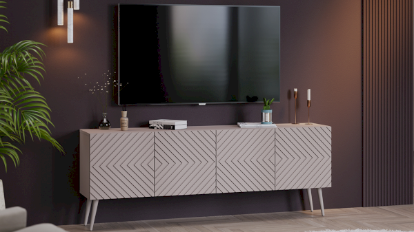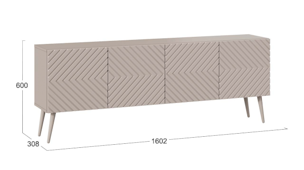 Тумба под ТВ обладает геометрическим силуэтом и привлекательной цветовой палитрой, превращая новинку в стильный модуль, который прекрасно дополнит современный интерьер гостиной.